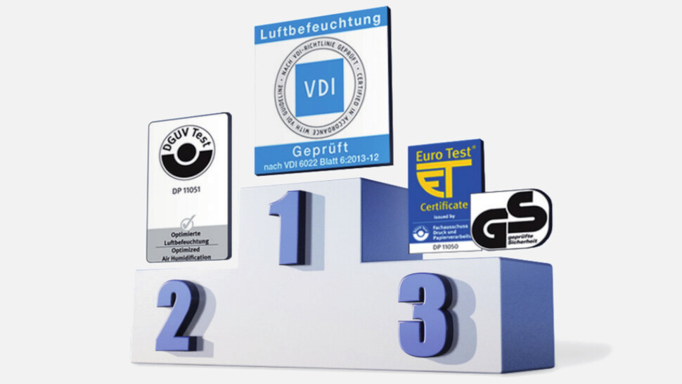 Mit dem DGUV Test-Zeichen "Optimierte Luftbefeuchtung und der zusätzlichen Zertifierung nach VDI 6022 Blatt 6 erfüllt die PerPur den aktuellen Stand der Technik und schützt vor Haftungsrisiken.
